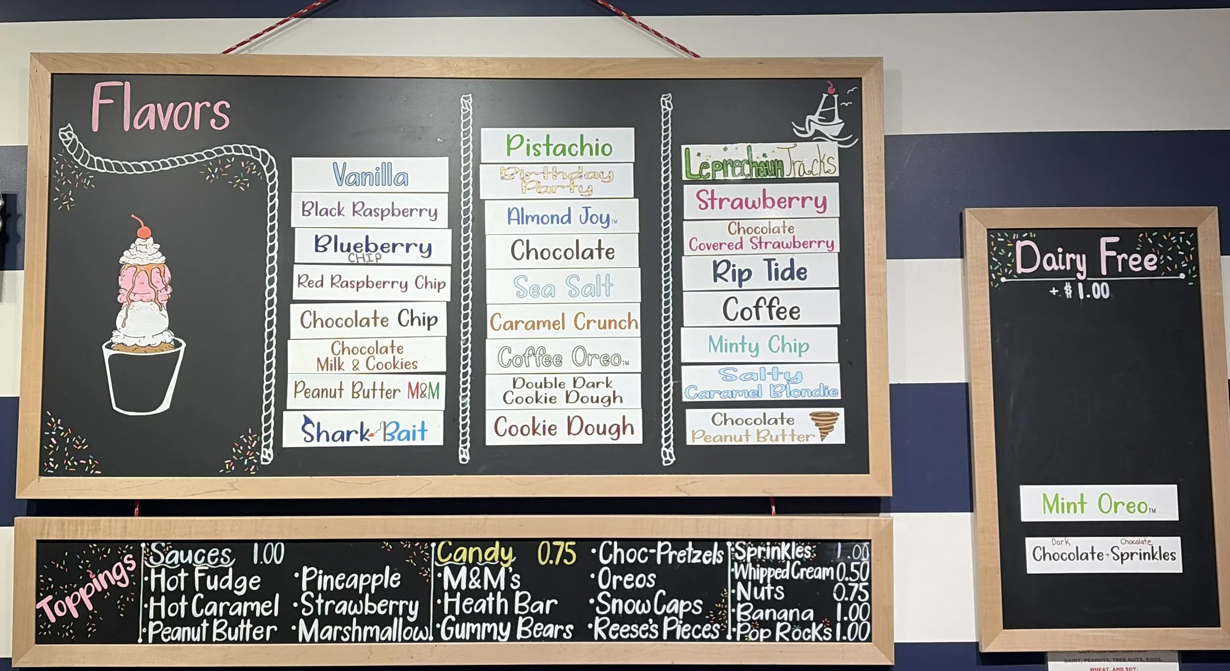 We are located in the heart o Newburyport Sunday - Thursday 12 to 8:30pm. Friday and Saturday 12 to 9pm. Indulge in a variety of scoops, pints, quarts, sundaes, extra thick frappes, and so many more specialties!!